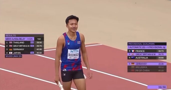 ทำลายสถิติประเทศไทยรุ่น 20 ปี ทีมวิ่งผลัด 4×100 เมตรชายไทย เข้าอันดับ 1 ของฮีท สถิติ 39.56 วินาที ทะลุชิงกรีฑาเยาวชนโลก วันอาทิตย์ที่ 1 ก.ย.นี้