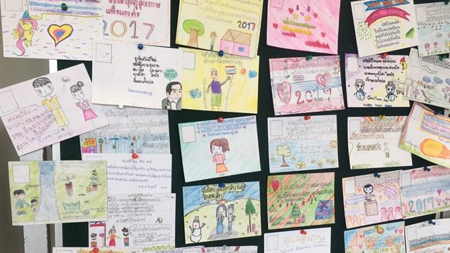สำนักนายกรัฐมนตรี นำส.ค.ส. ที่เด็กและเยาวชน ส่งมาอวยพรปีใหม่นายกรัฐมนตรี มาติดบอร์ดโชว์ ในงานวันเด็กแห่งชาติ