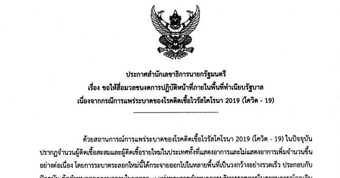 ประกาศสำนักเลขาธิการนายกฯ งดสื่อมวลชนเข้าปฏิบัติงานในทำเนียบรัฐบาล ตั้งแต่ 30 เม.ย.- 7 พ.ค.