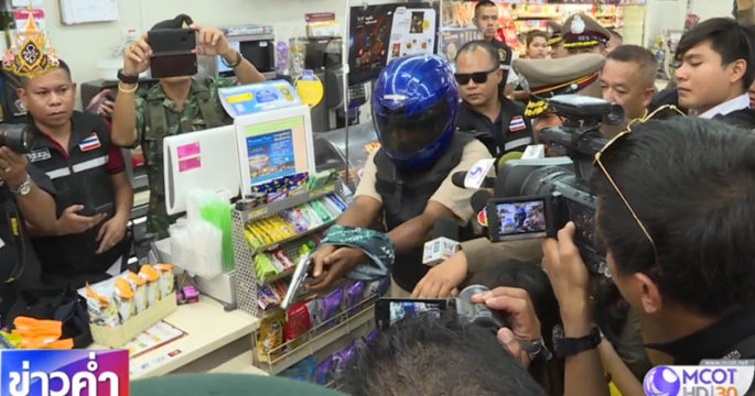 ตำรวจชุดสืบสวน สน.โชคชัย คุมตัวผู้ต้องหาชิงทรัพย์ร้านสะดวกซื้อ ในซอยนาคนิวาส 4 ไปทำแผนประกอบคำรับสารภาพ