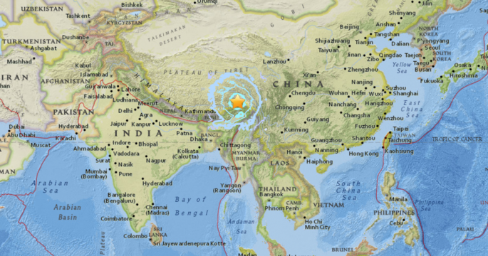 สำนักสำรวจธรณีวิทยาสหรัฐแจ้งว่า เกิดแผ่นดินไหวขนาด 6.3 บริเวณที่ราบสูงทิเบต ทางตอนใต้ของจีนวันนี้ ศูนย์กลางลึกเพียง 10 กิโลเมตร ขณะนี้ยังไม่ทราบความเสียหาย