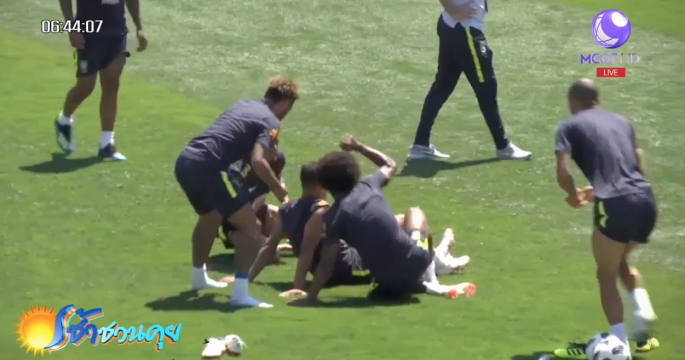 ฟิลิปเป คูตินโญ ถูกเพื่อนๆแกล้ง ร่วมฉลองวันเกิดครบ 26 ปี ในแคมป์ทีมชาติบราซิล ที่ลงฝึกซ้อมแบบเปิดให้แฟนบอลเข้ามาชม