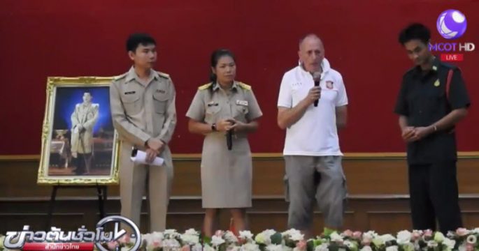 มิสเตอร์เวิร์น อันสเวิร์ธ นักสำรวจถ้ำชาวอังกฤษ ให้ความรู้และข้อควรปฏิบัติแก่เด็กๆ โรงเรียนแม่สายประสิทธิ์ศาสตร์ จ.เชียงราย ถึงการติดตามปฏิบัติการค้นหาทีมหมูป่า