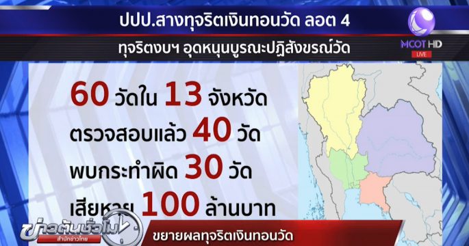 ปปป. เดินหน้าตรวจสอบทุจริตเงินทอนวัดลอตที่ 4 จำนวน 60 วัดใน 13 จังหวัด โดยพบการกระทำผิดแล้วเกือบ 30 วัด มูลค่าความเสียหายเบื้องต้น 100 ล้านบาท