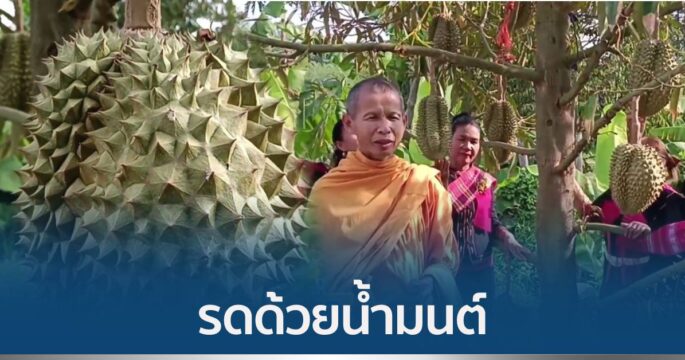 เจ้าอาวาสวัดสำโรงเกียรติ ปลูกทุเรียนภูเขาไฟรอบโบสถ์ สวดมนต์และนำน้ำปาฏิโมกข์มารดต้นทุเรียนทุกวันพระ