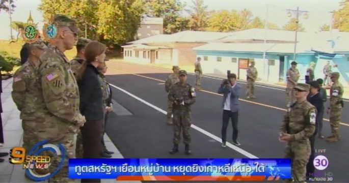 นางซาแมนธา พาวเวอร์ ทูตสหรัฐประจำสหประชาชาติ เดินทางไปเยี่ยมหมู่บ้านปันมุนจอม ในเขตหยุดยิงระหว่างเกาหลีเหนือ