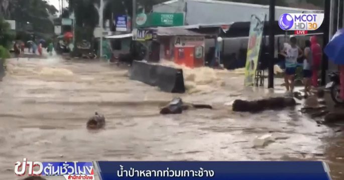 ฝนที่ตกหนักต่อเนื่องส่งผลให้เกิดน้ำป่าไหลหลากเข้าท่วมพื้นที่ สะพาน และบ้านเรือนริมคลองในอำเภอเกาะช้าง จังหวัดตราด