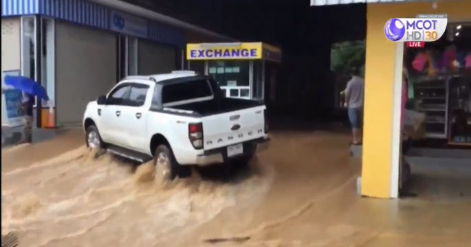 นี่เป็นคลิปวิดีโอที่ชาวบ้านบนเกาะช้าง จังหวัดตราด บันทึกภาพเหตุการณ์ขณะกระแสน้ำป่าเชี่ยวกรากไหลหลากลงคลองไก่แบ้ ก่อนเอ่อเข้าท่วมหลายพื้นที่ของเกาะช้าง ระดับน้ำสูงกว่า 1 เมตร รถไม่สามารถสัญจรได้