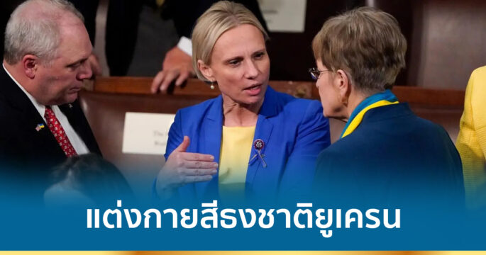 สมาชิกรัฐสภาสหรัฐแสดงความสนับสนุนยูเครนที่กำลังถูกรัสเซียรุกราน ด้วยการใช้เครื่องแต่งกายสีฟ้าและเหลือง ซึ่งเป็นสีของธงชาติยูเครน เข้าฟังประธานาธิบดีโจ ไบเดน