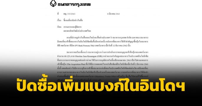 แบงก์กรุงเทพปฏิเสธข่าวซื้อธนาคารในอินโดนีเซียเพิ่ม ระบุซื้อหุ้นธนาคารพีที เพอร์มาตา ทีบีเคเท่านั้น
