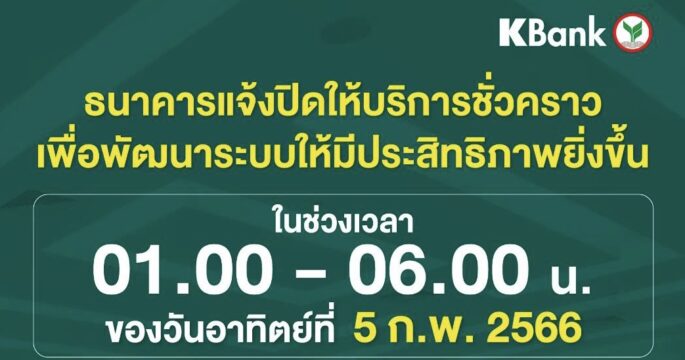กรุงเทพฯ 1 ก.พ. ธ.กสิกรไทย ปิดปรับปรุงบริการเป็นการชั่วคราว วันอาทิตย์ที่ 5 ก.พ.2566 เวลา 01:00 น. – 06:00 น. ส่งผลฝาก ถอน โอน ไม่ได้ทุกช่องทาง ยกเว้นบัตรเครดิตกสิกรไทยใช้ชำระค่าสินค้า-บริการได้ปกติ