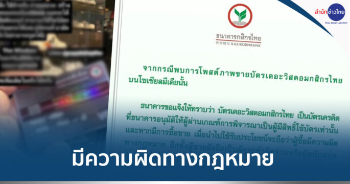 ธนาคารกสิกรไทยเผยกรณีพบการโพสต์ภาพขายบัตรเดอะวิสดอมกสิกรไทยบนโซเชียลมีเดียมีความผิดทางกฎหมาย