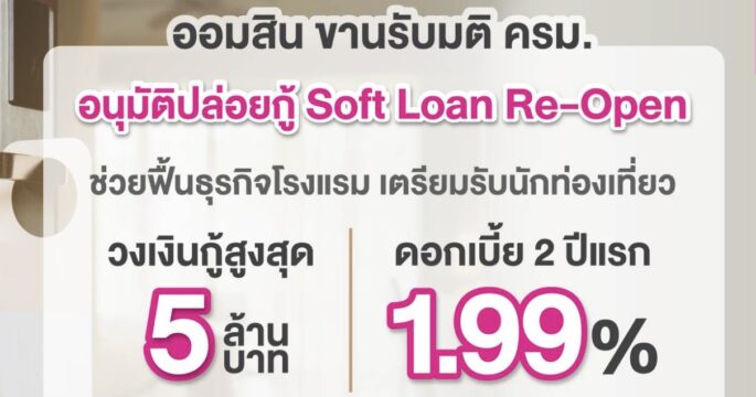 กรุงเทพฯ 27 ก.ค.-ออมสิน ขานรับมติ ครม. อนุมัติปล่อยกู้ Soft Loan Re-Open เปิดให้ผู้ประกอบการยื่นกู้ได้แล้วที่www.gsb.or.th และออมสินทุกสาขา หวังช่วยธุรกิจโรงแรมและ Supply Chain อ้าแขนรับนักท่องเที่ยว ฟื้นอุตสาหกรรมท่องเที่ยวไทย