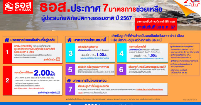 กรุงเทพฯ 27 ธ.ค. – ธอส. ออก 7 มาตรการช่วยเหลือผู้ประสบภัยน้ำท่วม ภาคใต้ตอนล่าง ลดภาระหนี้ บรรเทาความเสียหายบ้านเรือนประชาชน ด้วยเงื่อนไขผ่อนปรน ธนาคารอาคารสงเคราะห์ (ธอส.) ในฐานะสถาบันการเงินของรัฐ ที่มีพันธกิจ “ทำให้คนไทยมีบ้าน” พร้อมดำเนินการตามนโยบายรัฐบาลของ นายเศรษฐา ทวีสิน นายกรัฐมนตรี และรัฐมนตรีว่าการกระทรวงการคลัง ในการช่วยเหลือลูกค้าประชาชนที่ได้รับผลกระทบสถานการณ์น้ำท่วมฉับพลัน น้ำป่าไหลหลาก ส่งผลให้ที่อยู่อาศัยและการประกอบอาชีพของประชาชนในหลายจังหวัดพื้นที่ภาคใต้ตอนล่างได้รับความเสียหายอย่างหนัก ด้วยการจัดทำ “มาตรการช่วยเหลือผู้ประสบภัยพิบัติทางธรรมชาติ ปี 2567” ทั้งสิ้น 7 มาตรการ ประกอบด้วย มาตรการที่ 1 สำหรับลูกค้าปัจจุบันของ ธอส. ที่อยู่ระหว่างการใช้อัตราดอกเบี้ยลอยตัว (MRR -0.50%, MRR -1.00% หรือ MRR เป็นต้น) กรณีหลักประกัน (ที่อยู่อาศัยที่จดจำนองกับธนาคาร) ของตนเองหรือคู่สมรสได้รับความเสียหายจากการประสบภัยพิบัติทางธรรมชาติสามารถขอลดเงินงวด 50% จากเงินงวดที่ชำระปกติ และลดอัตราดอกเบี้ยเหลือ 2.00% ต่อปี เป็นระยะเวลา […]