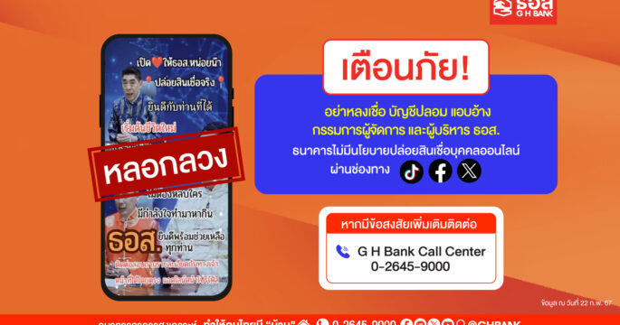 กรุงเทพฯ 22 ก.พ.-ธอส. เตือนภัย!! อย่าหลงเชื่อมิจฉาชีพแอบอ้างหลอกลวง ใช้ภาพกรรมการผู้จัดการ ปล่อยสินเชื่อบุคคลออนไลน์ ธนาคารอาคารสงเคราะห์ (ธอส.) ขอแจ้งเตือนภัย กรณีมีมิจฉาชีพนำตราสัญลักษณ์ของธนาคารและปลอม Account ในสื่อโซเชียล โดยใช้ภาพของนายกมลภพ วีระพละ กรรมการผู้จัดการ ธอส. เพื่อแอบอ้างปล่อยสินเชื่อบุคคลออนไลน์จากธนาคาร โดย ธอส. ขอยืนยันว่า ธนาคารและกรรมการผู้จัดการ ไม่มีส่วนเกี่ยวข้องกับ Account ปลอมดังกล่าว รวมถึงการแอบอ้างในสื่อโซเชียลต่าง ๆ ที่อาจใช้รูปภาพและกระทำในลักษณะเดียวกัน เพื่อหลอกลวงเอาเงินจากประชาชน ธอส.อยู่ระหว่างดำเนินการทางกฎหมายกับกลุ่มมิจฉาชีพที่แอบอ้างแล้ว และขอให้ประชาชนอย่าหลงเชื่อกลโกงของมิจฉาชีพอย่างเด็ดขาด พร้อมขอความร่วมมือไม่ส่งหรือแชร์ต่อในช่องทางสื่อสังคมออนไลน์ต่างๆ และเพื่อให้ประชาชนได้รับข้อมูลข่าวสารจากธนาคารอาคารสงเคราะห์ได้อย่างครบถ้วน สามารถติดตามได้ที่ www.ghbank.co.th หรือ G H Bank Call Center โทร 0-2645-9000 และ Facebook Fanpage ธนาคารอาคารสงเคราะห์.-515 สำนักข่าวไทย