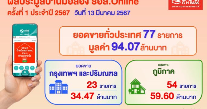 กรุงเทพฯ 14 มี.ค.-ธอส. ประมูลขายบ้านมือสองออนไลน์ จำหน่ายได้ 77 รายการ มูลค่ารวมกว่า 94 ล้านบาท ธนาคารอาคารสงเคราะห์ (ธอส.) เปิดเผยผลการจัด “งานประมูลบ้านมือสอง ธอส. ออนไลน์ ครั้งที่ 1 ประจำปี 2567” ซึ่งจัดขึ้นพร้อมกันทั่วประเทศ ผ่าน Application : GHB ALL HOME เมื่อวันพุธที่ 13 มีนาคม 2567 ระหว่างเวลา 12.00-12.30 น. สามารถจำหน่ายบ้านมือสองได้จำนวน 77 รายการ คิดเป็นมูลค่า 94.07 ล้านบาท แบ่งเป็นทรัพย์ที่ตั้งอยู่ในพื้นที่กรุงเทพฯ และปริมณฑล จำนวน 23 รายการ และในส่วนภูมิภาค 54 รายการ โดยรายการทรัพย์ที่ประมูลได้ในราคาต่ำที่สุดเพียง 235,000 บาท ได้แก่ ทรัพย์ประเภทบ้านเดี่ยว 1 ชั้น ขนาดเนื้อที่ […]