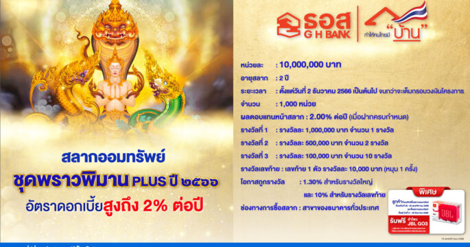 กรุงเทพฯ 15 พ.ย. -ธอส. มอบโชคส่งท้ายปี กับสลากออมทรัพย์สุดพรีเมียม “พราวพิมาน Plus” ปี 2566 หน่วยละ10 ล้านบาท ดอกเบี้ยสูง 2 % ต่อปี เปิดจองสิทธิ์ 20- 30 พ.ย.66 นี้