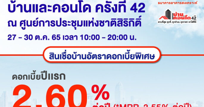ธอส. ขนโปรโมชั่นทางการเงิน นำโดย สินเชื่อบ้านดอกเบี้ยปีแรกเพียง 2.60% ต่อปีร่วมงาน “มหกรรมบ้านและคอนโด ครั้งที่ 42” วันที่ 27-30 ตุลาคม 2565 นี้