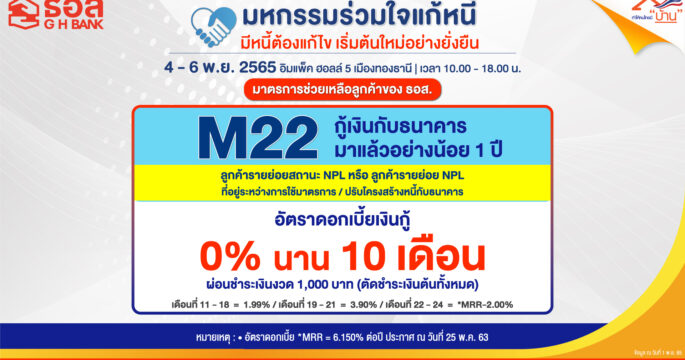 ธอส. จัดทำมาตรการ 22 [M22] ช่วยเหลือลูกค้ารายย่อยสถานะ NPL ผ่อนชำระเงินงวดต่ำพร้อมลดอัตราดอกเบี้ยเงินกู้พิเศษ ระยะเวลา 2 ปี