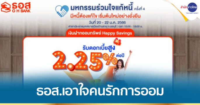 ธอส. จัดเงินฝากออมทรัพย์ Happy Savings อัตราดอกเบี้ยสูงสุด 2.25% ต่อปี เอาใจคนรักการออมในงานมหกรรมร่วมใจแก้หนี้ฯ ครั้งที่ 4 จ.ชลบุรี