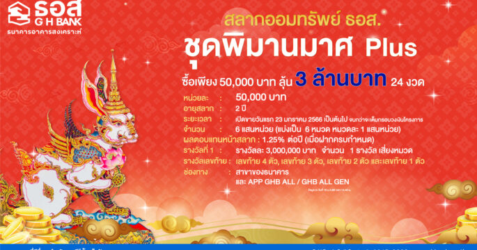 -ธอส. เปิดจำหน่าย “สลากออมทรัพย์ ธอส. ชุดพิมานมาศ Plus” วงเงิน 30,000 ล้านบาท หน่วยละ 50,000 บาท ผลตอบแทนสูงสุดร้อยละ 1.25 รายย่อยไม่เกิน 5 ล้านบาท เริ่มจำหน่าย 23 มกราคม 66