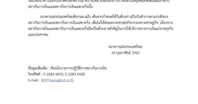 ธปท.ประกาศให้ 12 เม.ย.62 เป็นวันทำการปกติของสถาบันการเงิน-แบงก์รัฐ เพื่อไม่ให้กระทบกิจกรรม