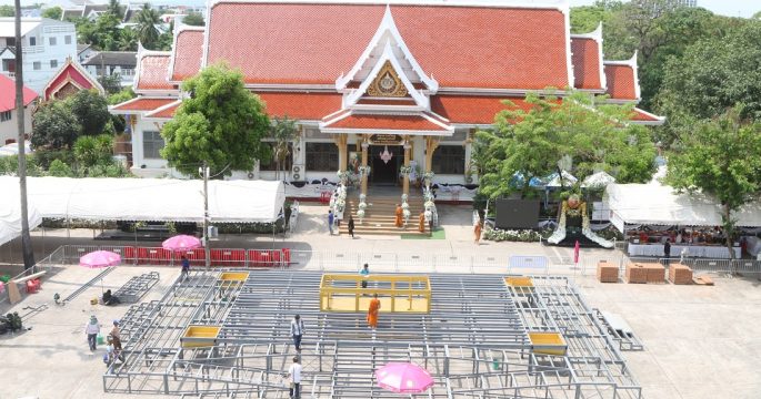 ทีมสรรพช่างเร่งจัดเตรียมสถานที่ก่อสร้างเมรุชั่วคราว ในพิธีพระราชทานเพลิงศพ หลวงพ่อคูน ปริสุทโธ พร้อมตกแต่งอาคาร 3 หลังที่อยู่โดยรอบเพื่อให้ทันกำหนดงานพิธีที่จะมีขึ้นระหว่างวันที่ 21-30 ม.ค.นี้