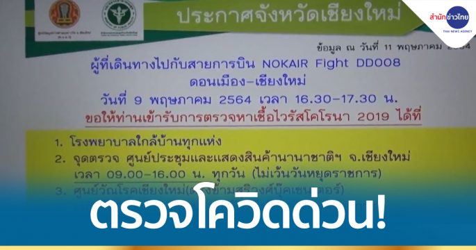 สาธารณสุข จ.เชียงใหม่ แจ้งเตือนผู้โดยสารสายการบินนกแอร์ วันที่ 9 พ.ค. เที่ยวบิน DD008 เส้นทางดอนเมือง-เชียงใหม่ เวลา 16.30-17.30 น. ไปตรวจหาเชื้อโควิด-19 ด่วน เนื่องจากพบผู้โดยสารเที่ยวบินดังกล่าวติดโควิด-19