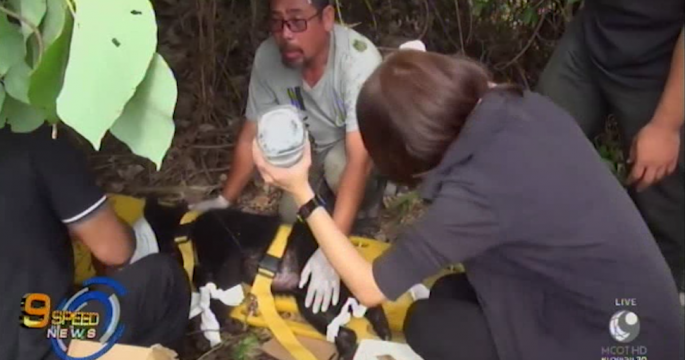 ลูกหมีควายวัยขวบเศษปีนเสาไฟฟ้าบริเวณพงหญ้าใกล้โรงงานผลิตกระแสไฟฟ้าเขื่อนขุนด่านปราการชล ถูกไฟช็อตตกมากระแทกพื้น แพทย์เข้าช่วยเหลือไม่เป็นผล