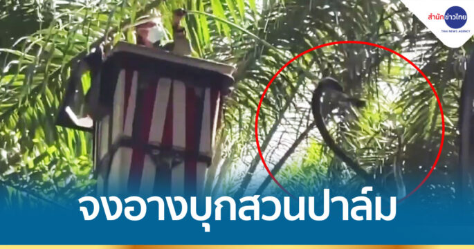 จงอางโตเต็มวัย ยาวกว่า 3 เมตร ชูคอสู้กับสุนัขเฝ้าสวน ก่อนที่จะเลื้อยหนีขึ้นต้นปาล์ม ด้านเจ้าของแจ้งกู้ภัยให้มาช่วยจับเกรงได้รับอันตราย
