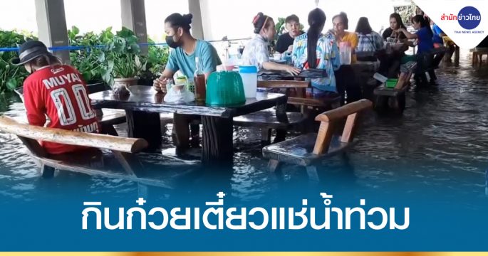 นักชิมแห่กินก๋วยเตี๋ยวไก่ต้มยำ ริมแม่น้ำท่าจีน จ.นครปฐม หลังชาวเน็ตแห่โพสต์ นั่งแช่น้ำท่วมกินก๋วยเตี๋ยว ใกล้ชิดปลาตะเพียนที่ว่ายวนอยู่รอบตัว