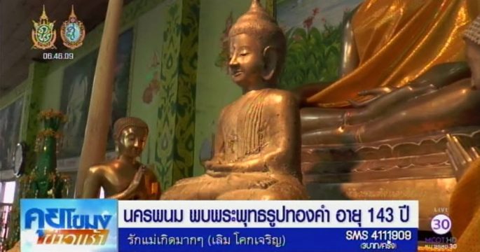 พระลูกวัด จ.นครพนม พบพระพุทธรูปเนื้อทองคำอายุ 143 ปี ถูกเก็บรักษาไว้ที่วัดศรีจำปา โดยช่างหล่อแบบสัมฤทธิ์หุ้มองค์พระปิดไว้ เพื่อไม่ให้ถูกขโมย