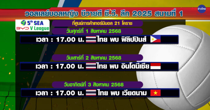 31 ก.ค. – อัจฉราพร คงยศ และพรพรรณ เกิดปราชญ์ นำทีมนักตบลูกยางสาวไทย ลุยศึกวอลเลย์บอลหญิง “BYD SEA V League 2025″ สนามที่ 1 ที่จังหวัดนครราชสีมา สมาคมกีฬาวอลเลย์บอลแห่งประเทศไทย ประกาศรายชื่อนักกีฬาวอลเลย์บอลหญิงทีมชาติไทย จำนวน 14 คน ชุดสู้ศึกวอลเลย์บอลหญิง “BYD SEA V League 2025″ สนามที่ 1 ซึ่งจะจัดขึ้นระหว่างวันที่ 1-3 สิงหาคมนี้ ที่ศูนย์การค้าเทอร์มินอล 21 โคราช จังหวัดนครราชสีมา สำหรับการแข่งขันรายการนี้จัดขึ้นต่อเนื่องเป็นปีที่ 5 โดยมี 4 ชาติจากอาเซียน เข้าร่วมแข่งขัน ประกอบด้วย ไทย, เวียดนาม, อินโดนีเซีย และฟิลิปปินส์ โดยรายชื่อนักตบสาวไทย ประกอบด้วย ตำแหน่งบอลเร็ว ทัดดาว นึกแจ้ง, กัญญารัตน์ ขุนเมือง, […]