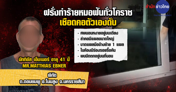 ชายเยอรมันคลั่งไล่ทำร้ายหมอฟันทั่วเมืองโคราช ถูกพบเป็นศพภายในบ้านพัก เจ้าหน้าที่คาดเป็นการจบชีวิตตัวเอง หลังพบลายนิ้วมือของผู้ตายบนอาวุธมีดที่ใช้ก่อเหตุ