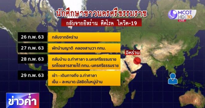 จ.นครศรีธรรมราช คุมเข้มฆ่าเชื้อทุกจุด หลังพบนักศึกษาชายอายุ 20 ปี กลับจากอิหร่าน ป่วยโควิด-19 พร้อมกักตัวญาติที่อยู่บ้านเดียวกันอย่างน้อย 3 คน