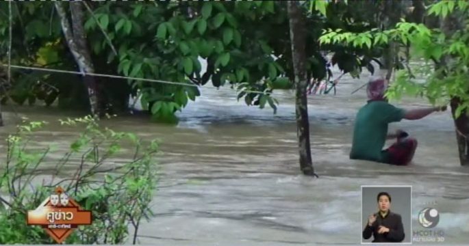 ชาวบ้านที่ ต.นาวง อ.ห้วยยอด จ.ตรัง ระดับน้ำยังไหลเชี่ยว และท่วมสูงกว่า 1 เมตร ชาวบ้านมีเรือเพียง 1 ลำ จึงต้องเดินไต่เชือกที่ผูกไว้กับต้นไม้ ออกจากบ้าน มารับอาหาร