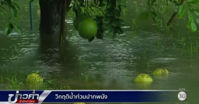 สถานการณ์น้ำท่วมใน จ.นครศรีธรรมราช ล่าสุดน้ำได้ไหลลงพื้นที่ท้ายน้ำ โดยเฉพาะในพื้นที่ อ.ปากพนัง และเริ่มส่งผลกระทบต่อพืชผลการเกษตร โดยเฉพาะส้มโอพันธุ์ทับทิมสยาม
