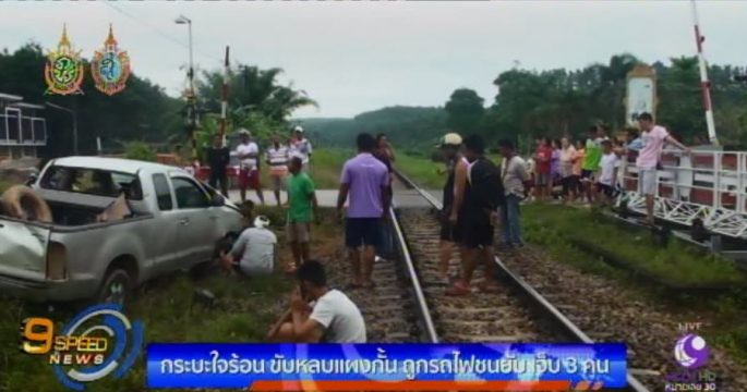 กระบะใจร้อนขับหลบแผงกั้นถูกขบวนรถไฟพุ่งชนยับที่ จ.นครศรีธรรมราช 3 ชีวิตปลอดภัย ก่อนถูกนำตัวส่งโรงพยาบาล