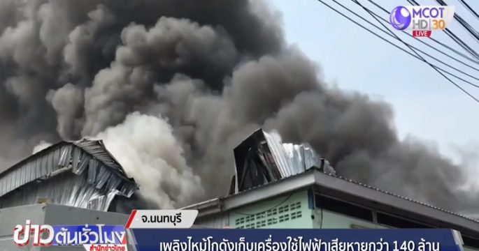 เจ้าหน้าที่ดับเพลิงกว่า 30 คัน ระดมฉีดน้ำสกัดเพลิงที่ลุกไหม้โกดังเก็บสินค้าประเภทเครื่องใช้ไฟฟ้า ภายใน ซ.ไทยร่มเกล้า อ.บางใหญ่ จ.นนทบุรี มูลค่าความเสียหายมีมากกว่า 140 ล้านบาท