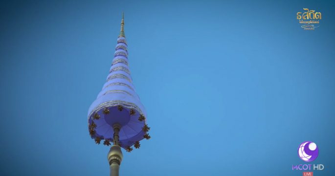 สมเด็จพระเจ้าอยู่หัว ทรงยกนพปฎลมหาเศวตฉัตรยอดพระเมรุมาศ ในการพระราชพิธีถวายพระเพลิงพระบรมศพ พระบาทสมเด็จพระปรมินทรมหาภูมิพลอดุลยเดช