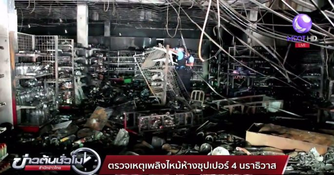 เจ้าหน้าที่อีโอดีและตำรวจนราธิวาสลงพื้นที่ตรวจสอบภายในห้างซุปเปอร์ 4 นราธิวาส หลังเกิดเหตุเพลิงไหม้เมื่อคืนวานนี้ เบื้องต้นยังไม่พบวัตถุระเบิดต้องสงสัยที่ทำให้เกิดเพลิงไหม้