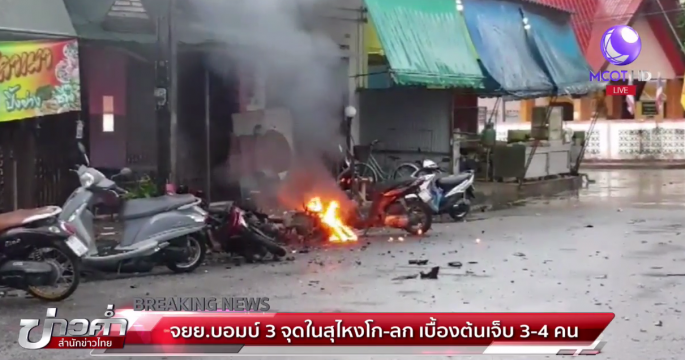 เกิดเหตุระเบิดรวม 3 จุด ในอำเภอสุไหงโก-ลก จังหวัดนราธิวาส เบื้องต้นมีผู้บาดเจ็บ 3-4 คน ฝ่ายความมั่นคงเร่งปิดล้อมพื้นที่เพื่อติดตามตัวคนร้าย