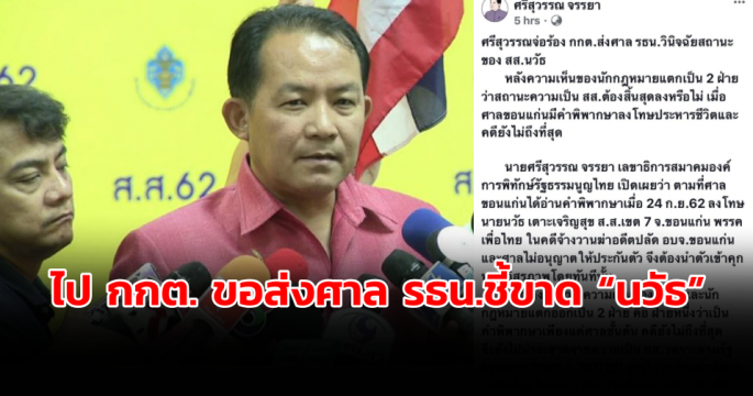 “ศรีสุวรรณ” ระบุ ศาลรัฐธรรมนูญเป็นองค์กรชี้ขาดปมสมาชิกภาพ “นวัธ เตาะเจริญสุข” พรุ่งนี้จะไปขอกกต.ใช้อำนาจส่งเรื่องศาลรัฐธรรมนูญวินิจฉัย