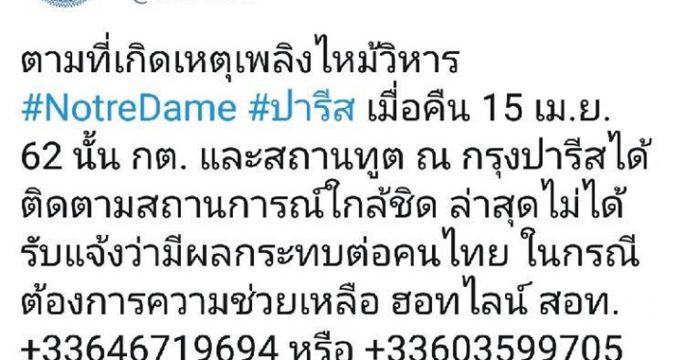 กทม. 16 เม.ย.-กระทรวงการต่างประเทศ เผย ไม่มีคนไทยได้รับผลกระทบจากเหตุเพลิงไหม้มหาวิหารนอเทรอดาม ที่กรุงปารีส