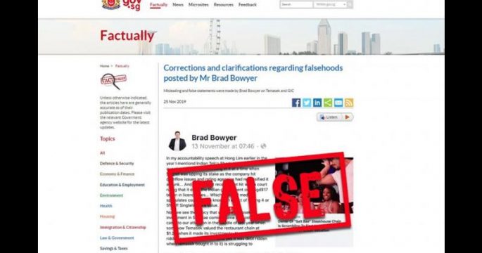 นายแบรด โบว์เยอร์ นักการเมืองสิงคโปร์ได้แก้ไขโพสต์ตามคำขอของรัฐบาลบนเฟซบุ๊ก ของตัวเองที่ตั้งคำถามเกี่ยวกับความเป็นอิสระของกองทุนของรัฐ