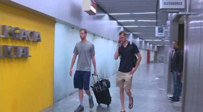 ตำรวจบราซิลนำตัวนักว่ายน้ำทีมชาติสหรัฐที่เข้าร่วมการแข่งขันโอลิมปิก 2 คน ลงจากเครื่องบินขณะเตรียมเดินทางออกจากบราซิลเพื่อสอบปากคำเรื่องที่อ้างว่าถูกปล้น