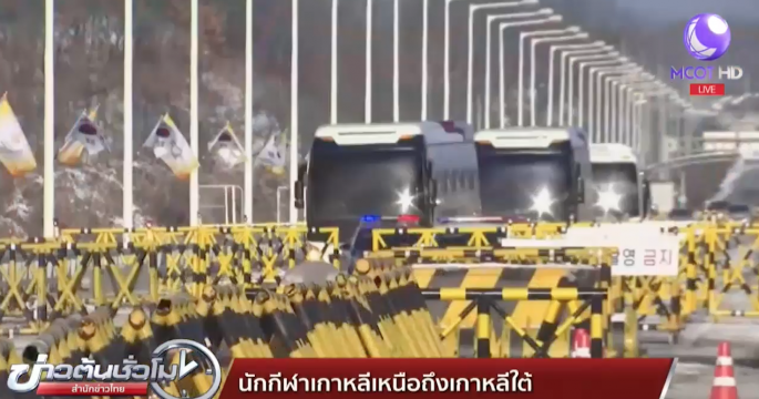 ขบวนรถซึ่งเชื่อว่าเป็นคาราวานทีมนักกีฬาฮอกกี้หญิงเกาหลีเหนือ 12 คน เดินทางข้ามสะพานทองกิล เข้ามายังฝั่งเกาหลีใต้แล้ว