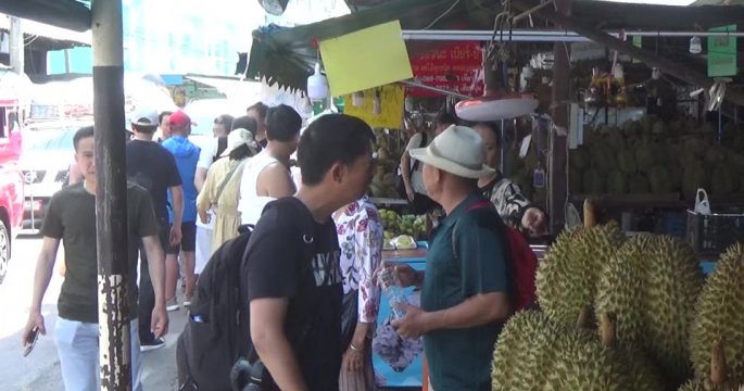 เชียงใหม่ 9 มิ.ย.-ร้านแทบแตก! นักท่องเที่ยวจีนเช่าเครื่องเหมาลำบินมากินทุเรียนที่เชียงใหม่ในช่วงวันหยุดสุดคึกคัก แม้จะอยู่ในช่วงโลว์ซีซั่น เนื่องจากทุเรียนไทยราคาถูกกว่าที่จีนหลายเท่า ส่วนใหญ่เป็นกลุ่มผู้สูงอายุ ส่งผลดีต่อพ่อค้าแม่ค้าและรถรับจ้าง ผู้สื่อข่าวรายงานจาก จ.เชียงใหม่ ว่า ในช่วงวันหยุดแบบนี้ มีนักท่องเที่ยวชาวจีนพากันหลั่งไหลมาซื้อทุเรียนที่บริเวณตลาดผลไม้เมืองใหม่ในตัวเมืองเชียงใหม่กันอย่างคึกคัก ทำให้พ่อค้าแม่ค้าขายดิบขายดี โดยเฉพาะทุเรียน ราชาผลไม้ไทย ที่นักท่องเที่ยวจีนพากันรุมล้อม แย่งกันซื้อทุเรียนราคากิโลกรัมละ 160-180 บาท หรือลูกละประมาณ 500 บาท ซึ่งถือว่าราคาถูกกว่าในประเทศจีนหลายเท่า แล้วยืนกินที่หน้าแผงขายอย่างเอร็ดอร่อย สร้างรายได้ให้กับพ่อค้าแม่ค้าและรถสามล้อตุ๊กๆเป็นอย่างดี นายสมบัติ แซ่จง ไกด์นำเที่ยว เปิดเผยว่า ช่วงนี้เป็นช่วงโลว์ซีชั่น แต่ยังมีนักท่องเที่ยวจีนเช่าเหมาลำเครื่องบิน เข้ามาเที่ยวเชียงใหม่เพื่อมากินทุเรียนโดยเฉพาะ รวมทั้งเที่ยวตามวัดวาอาราม แต่ก็ถือว่านักท่องเที่ยวจีนลดลงถึงร้อยละ 30 ในช่วงหลายปีที่ผ่านมา อย่างไรก็ตาม เดือนหน้า(กรกฎาคม) เป็นช่วงปิดภาคเรียนในประเทศจีน เชื่อว่าจะมีนักท่องเที่ยวจีนมาเที่ยวเชียงใหม่เพิ่มขึ้นมากกว่านี้ จนกว่าจะเข้าสู่ฤดูหนาว ซึ่งเป็นช่วงไฮซีชั่นของภาคเหนือ “ที่นักท่องเที่ยวจีนนิยมมารับประทานทุเรียนที่บ้านเรา เพราะมีราคาถูกกว่า ซึ่งในประเทศจีนไม่มี หากมีก็จะขายราคาแพงมาก เรียกว่าแพงกว่าเมืองไทยหลายเท่า ทำให้มีการจัดทัวร์มากินทุเรียนที่เชียงใหม่” ไกด์นำเที่ยว กล่าว.-สำนักข่าวไทย