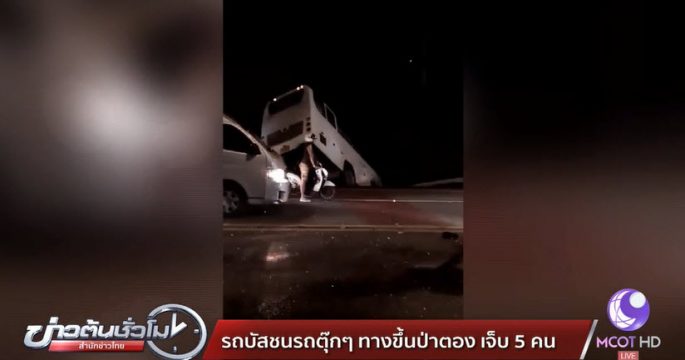รถบัสนักท่องเที่ยวจีน ชนกับรถตุ๊กตุ๊ก ก่อนเสียหลักพุ่งชนรถตู้โดยสารอีก 3 คัน รถจักรยานยนต์ และพุ่งชนไหล่ทางเขาป่าตอง อ.กะทู้ จ.ภูเก็ต เจ็บ 5 คนขับรถบัส สาหัส