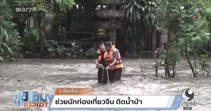 เจ้าหน้าที่กู้ภัยเข้าช่วยเหลือนักท่องเที่ยวชาวจีน 10 ชีวิต ที่ติดเกาะบริเวณร้านอาหารเชิงดอยคำ จ.เชียงใหม่ ฝ่าน้ำป่าไหลหลากออกมาได้อย่างปลอดภัย ขณะที่ระดับน้ำที่ไหลเชี่ยวเริ่มลดลงอย่างต่อเนื่อง โดยเหตุการณ์ครั้งนี้เป็นครั้งที่ 2 ในรอบ 3 วัน ที่มีมวลน้ำไหลท่วมพื้นที่ และถือว่ารุนแรงในรอบ 10 ปี